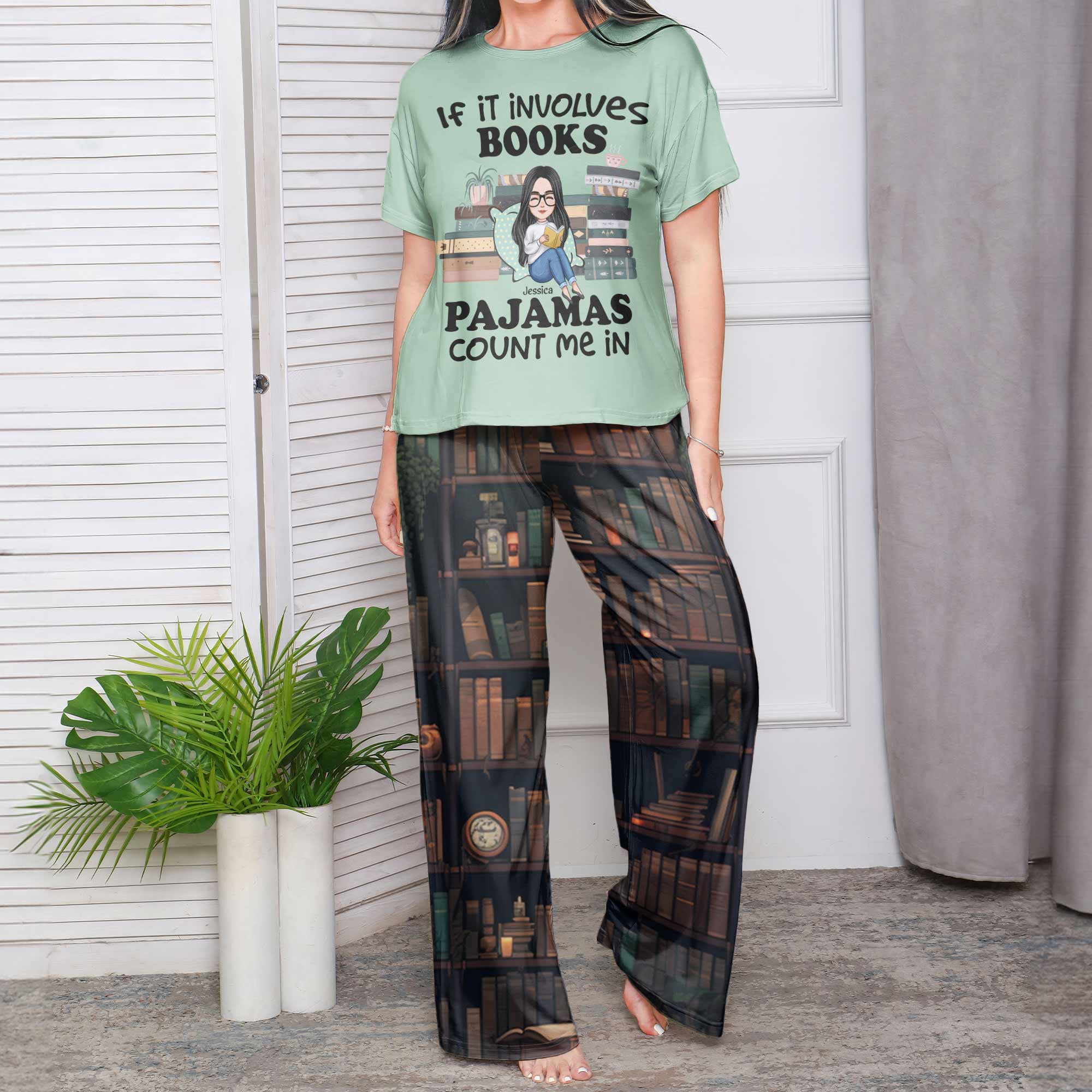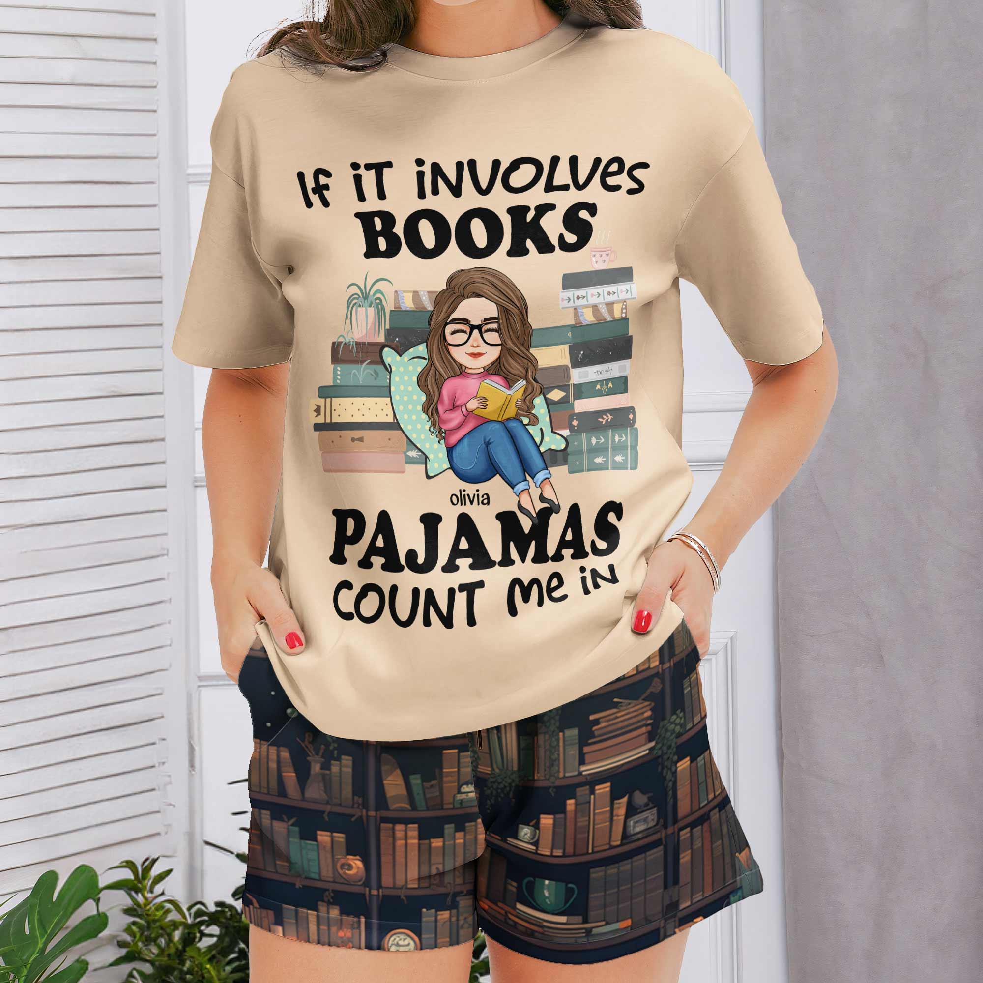 If you love reading and relaxing in your pajamas, this personalized pajamas set is for you. This pajamas set features a fun and catchy phrase “If it involves book and pajamas, count me in” on the pajama shirt, along with a character of yourself sitting around book piles. You can customize the character to match your appearance, making this a truly unique and personal gift.