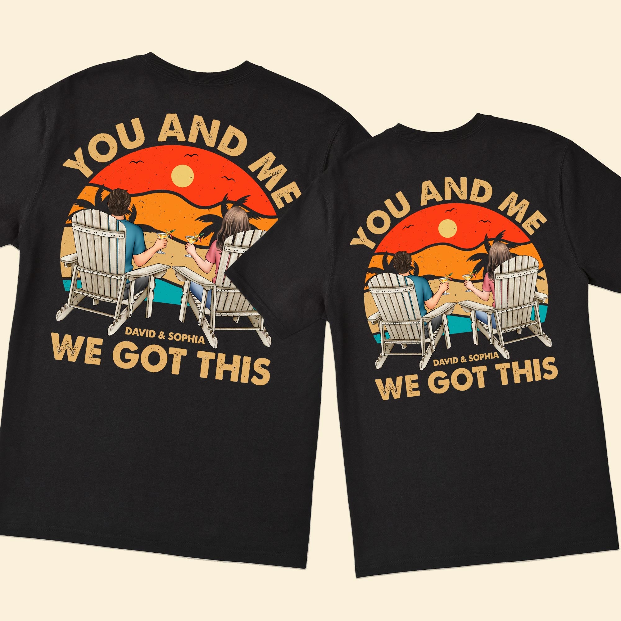 Introducing our Personalized Back Printed Shirt, the perfect way to celebrate your love and unity with matching couple shirts! These shirts feature the heartfelt message, 'You and me, we got this,' and can be customized with characters that resemble you and your partner.
