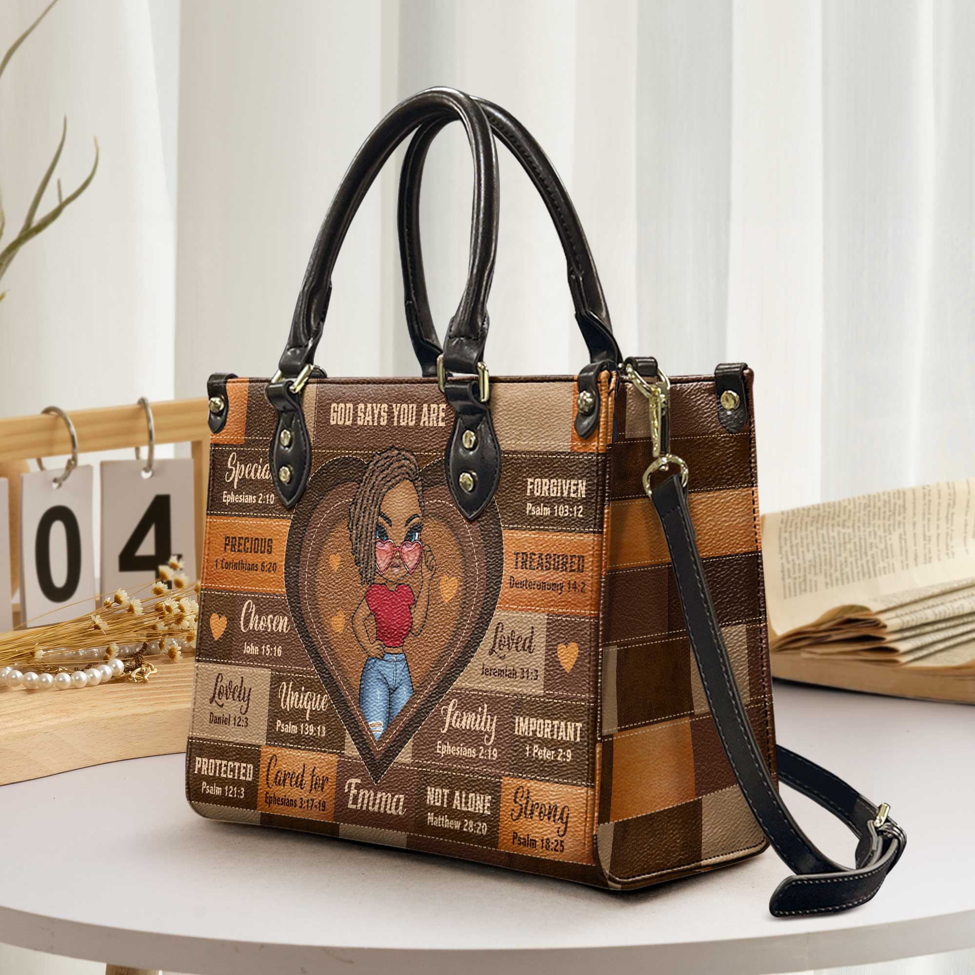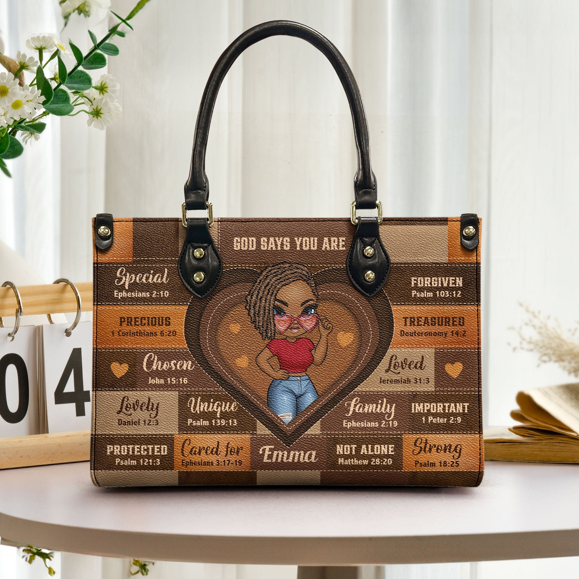 Elevate your style and spirit with our Personalized Leather Bag, a heartfelt embodiment of faith and empowerment. Printed with inspiring scriptures 'God Says You Are,' this bag serves as a constant reminder of your worth and strength. Customize the character and add your name, making this bag uniquely yours. Perfect as a gift for friends, sisters, or mom, this motivational masterpiece is also ideal for black girls and women seeking daily affirmation and empowerment. Whether it's for birthdays, Christmas, or just because, our personalized leather bag is a thoughtful expression of love and support. Treat yourself or someone special today and carry the power of positivity wherever you go.