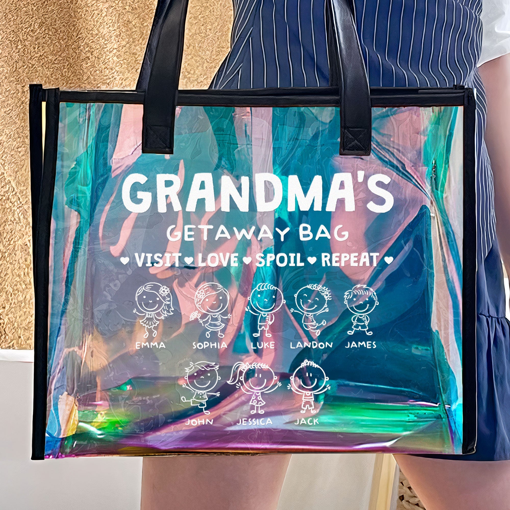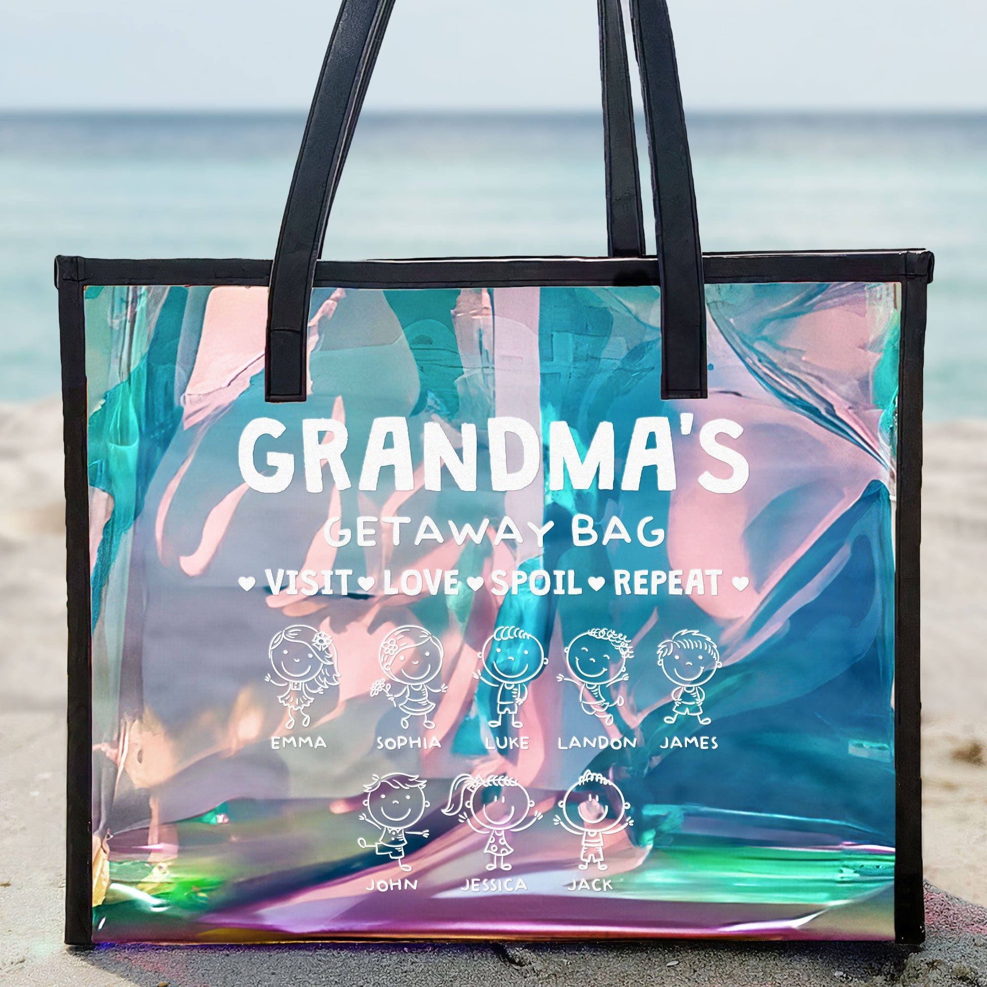 Makes a Perfect gift for that special Grandma: Grandma's Getaway Holographic Tote. Perfect for that new grandma! Our hologram tote bag will be perfect filled with Grandma's favorite things. Makes a great book bag, shopping bag, shopping tote, library tote. Show your grandma how special she is. Makes a great Mother's Day gift, Birthday gift, Christmas gift, or pregnancy announcement gift.