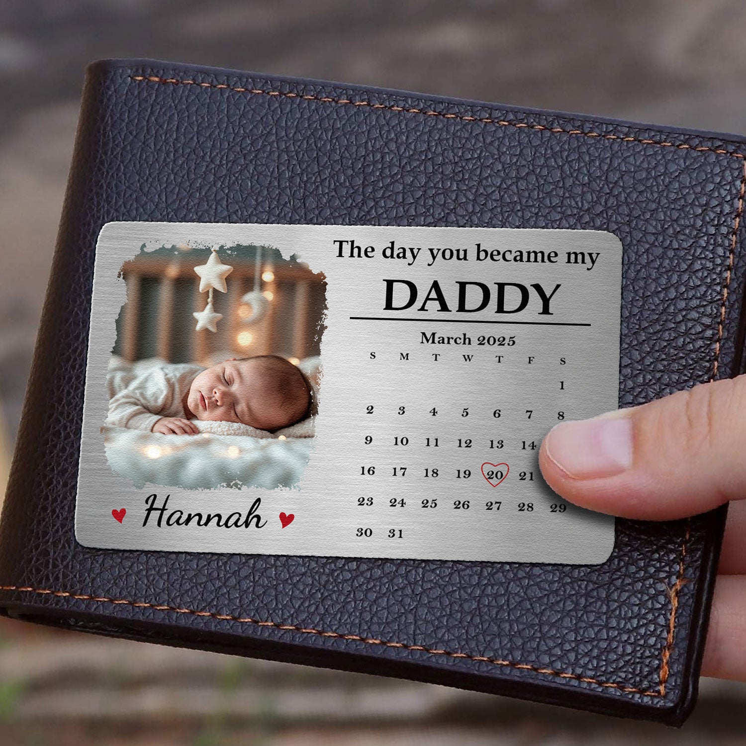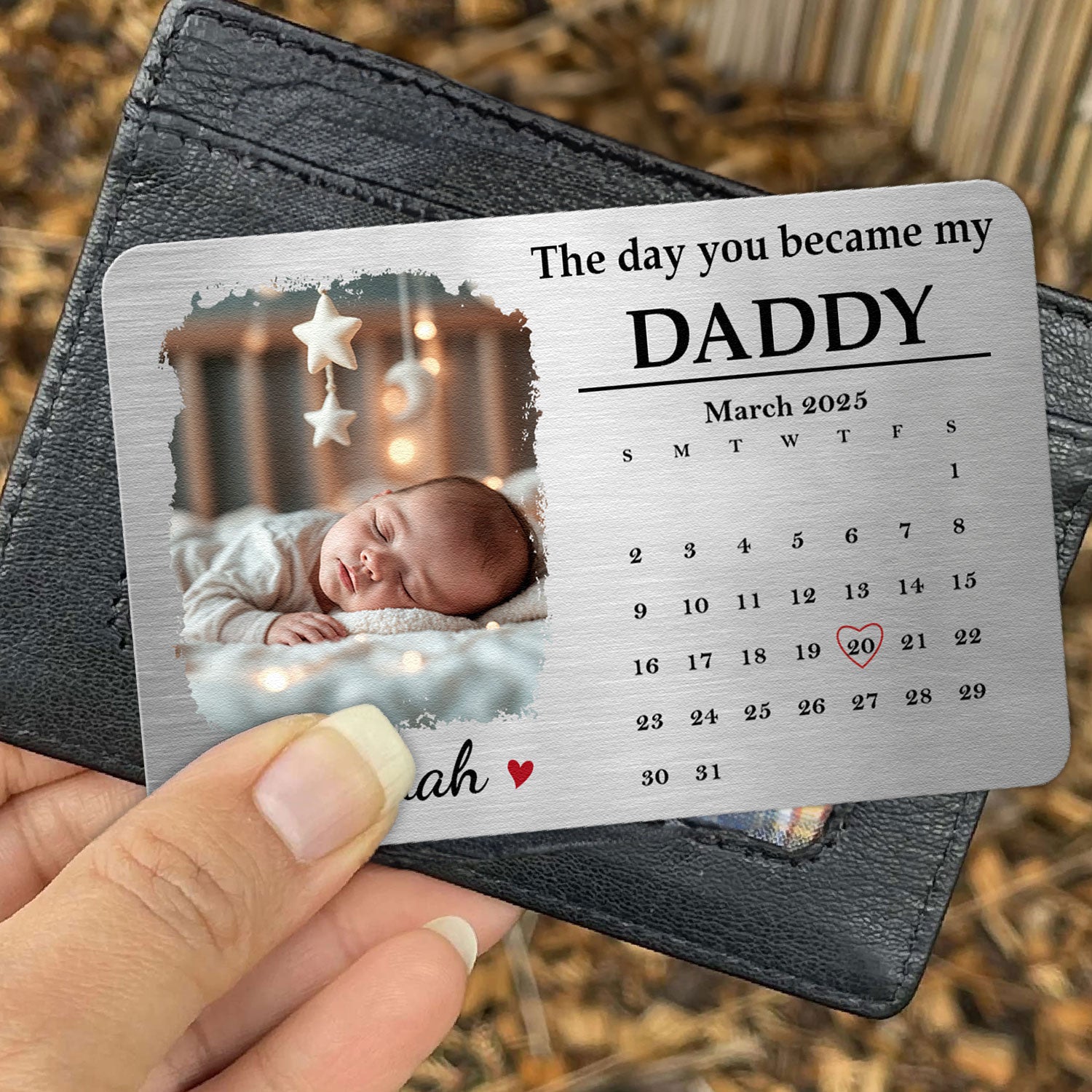 Presenting our Personalized Aluminum Wallet Card, aptly named 'The Day You Became.' This unique keepsake is tailored towards dads, signifying strong bonds and immeasurable family ties. It serves as an intimate token reflecting the day a man takes on the paramount role of fatherhood. Perfect for the occasion of welcoming a newborn, birthdays, Christmas, anniversaries, or just any day to express how much they mean to you.
