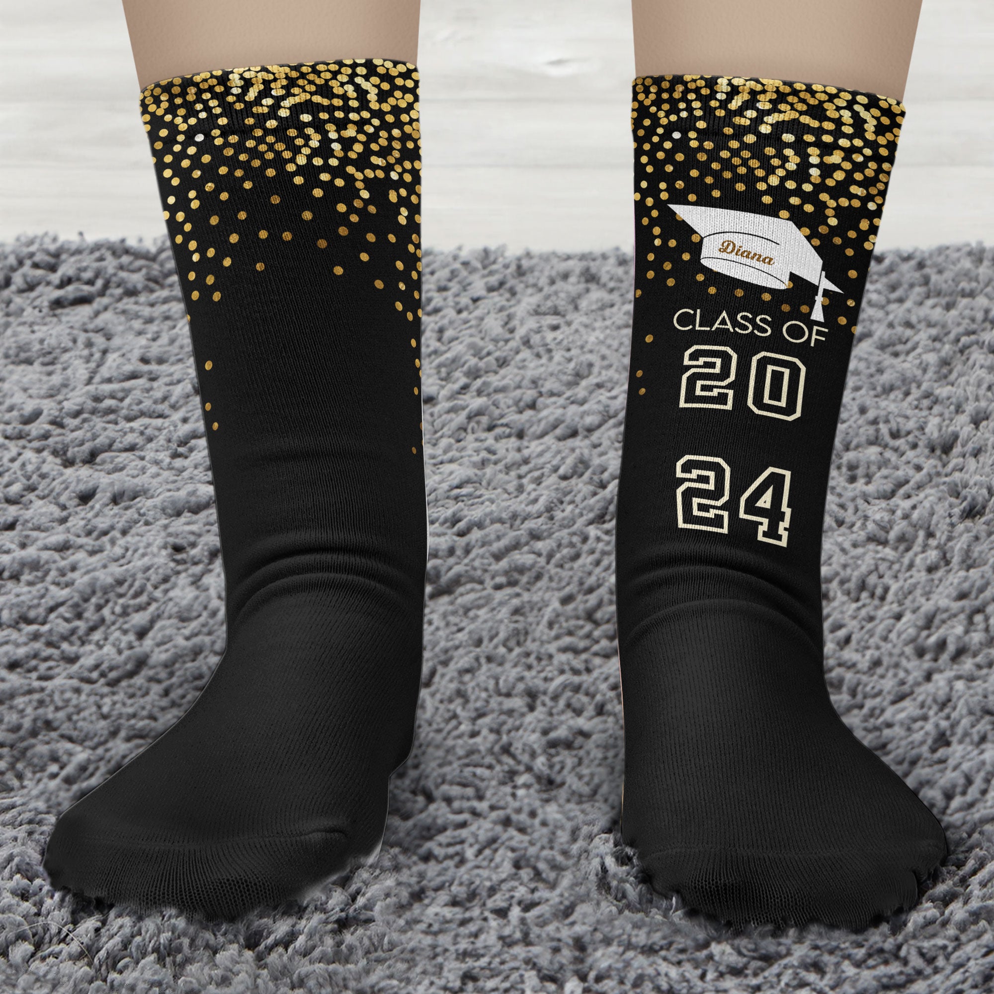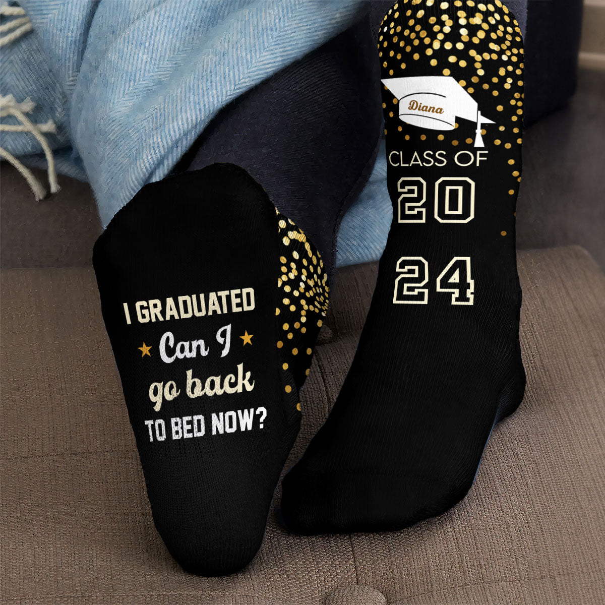 The graduation socks are pretty fluffy, stretchy, and comfortable. Thick breathable cotton keeps your feet warm and cozy and without feeling smelly after a long wear. The stockings are decorated with unique pixel patterns and an interesting proverb: 'I graduated, can I go back to bed now?'. They are perfect for graduation gifts!