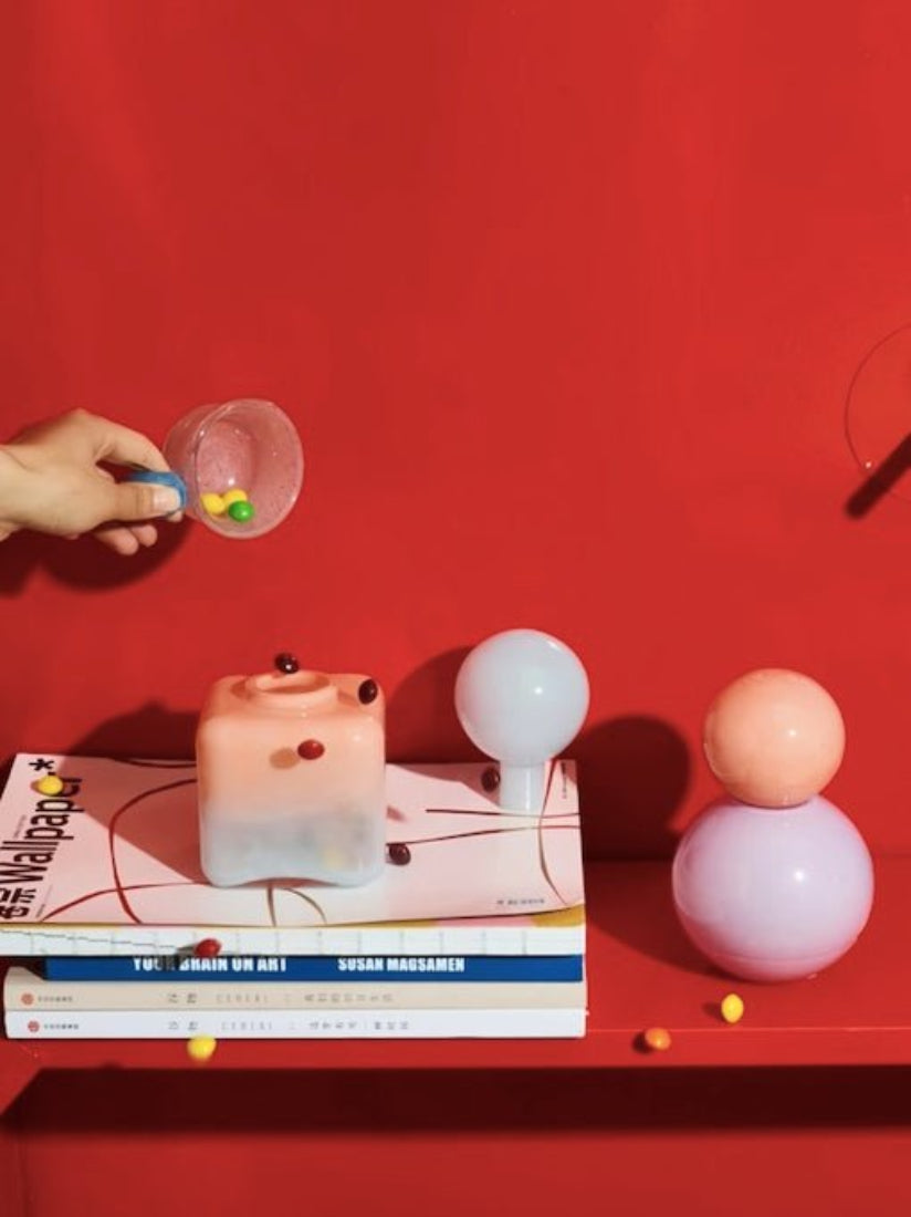 Take inspiration from confection, these cute whimsical decorative jar are handblown by skill artisans and infused with a sense of freshness and dopamine colours. These uniquely crafted design provide a perfect hiding place for your treasured keepsakes or serve as a delightful statement piece in the home, transforming your space into a wonderland. They could also be used as diffuser bottle sitting on the shelf to scent & accent your home.