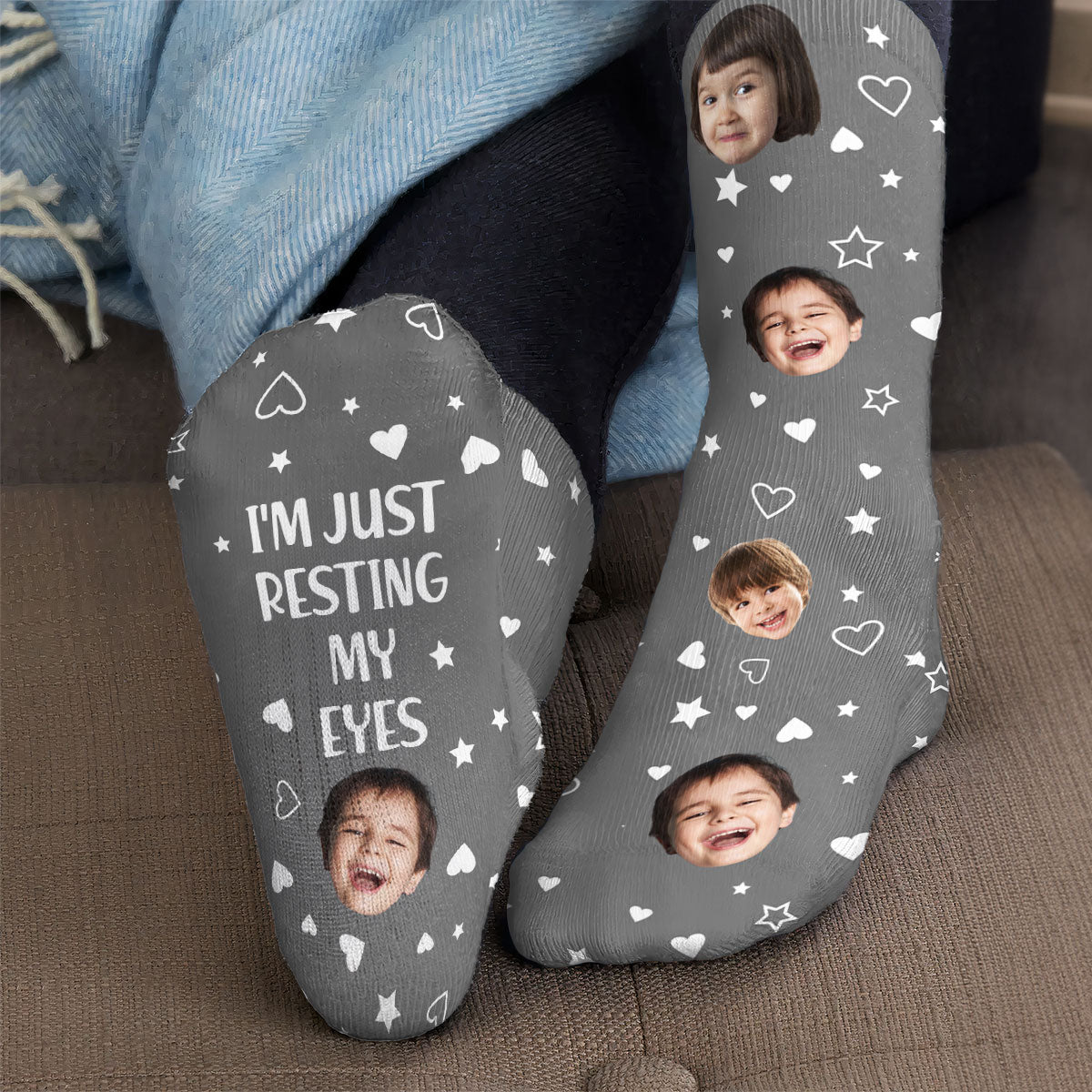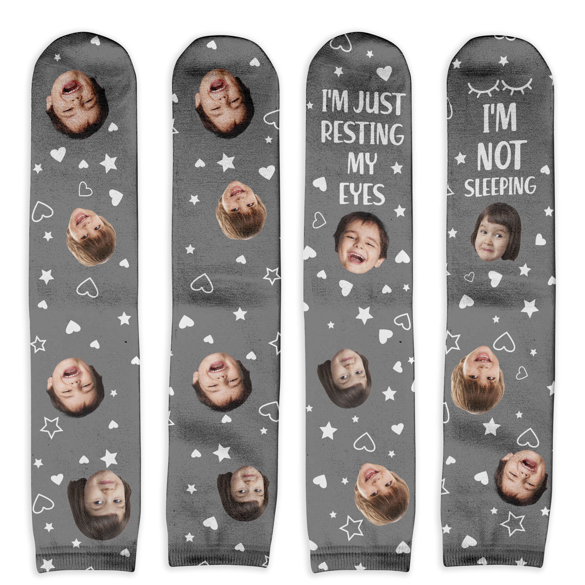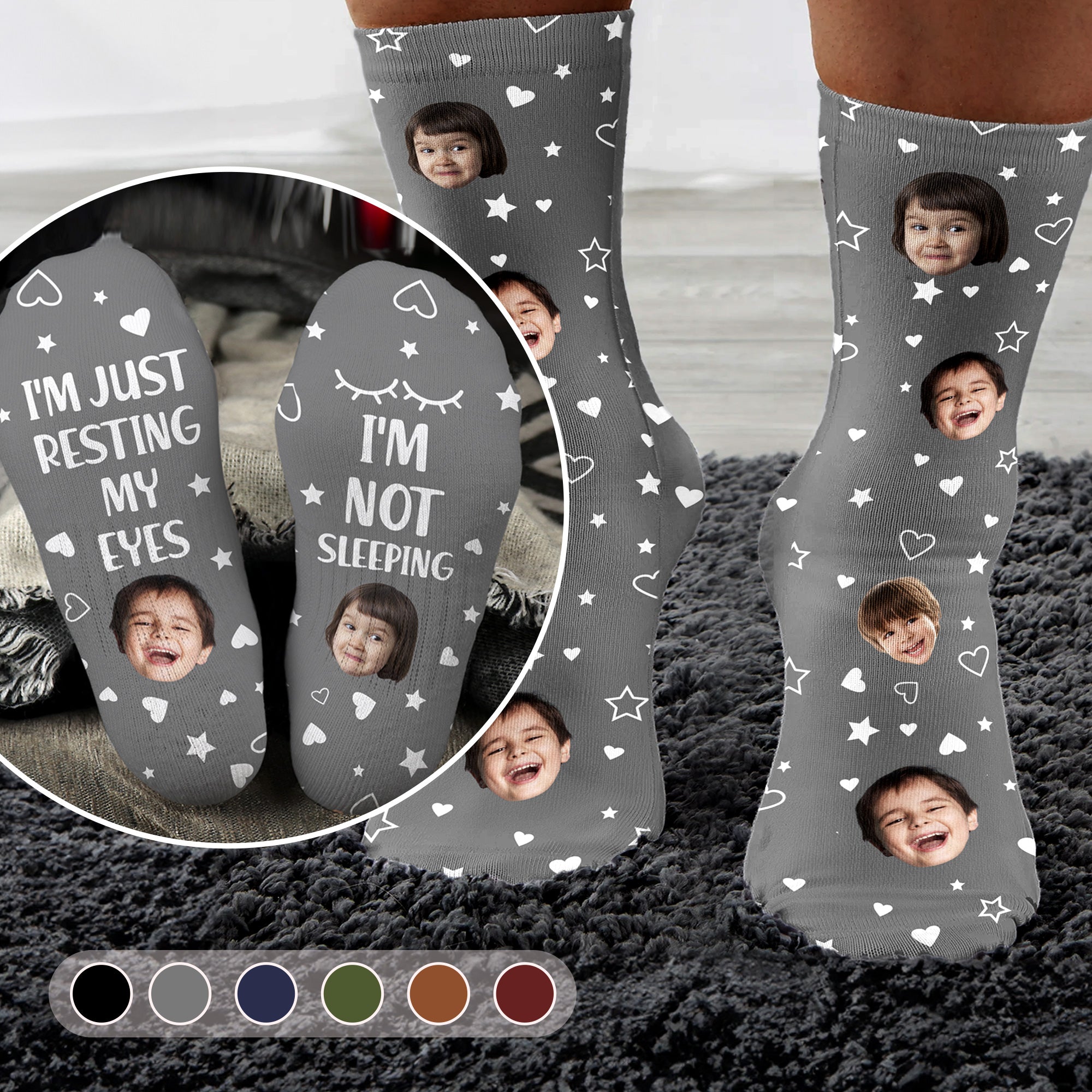 Introducing our Personalized Crew Socks: 'Custom Faces - I'm Just Resting My Eyes.' These socks are not just socks; they're a fun and personalized way to celebrate Dad on Father's Day, birthdays, Christmas, or retirement. Featuring custom faces of loved ones, they add a unique and heartfelt touch to his wardrobe. Perfect for dads from daughters, sons, or wives, these socks are a thoughtful and humorous gift that will bring a smile to his face with every step. Give him the gift of comfort and laughter with our Personalized Crew Socks – a great addition to his sock collection and a reminder of the special people in his life.