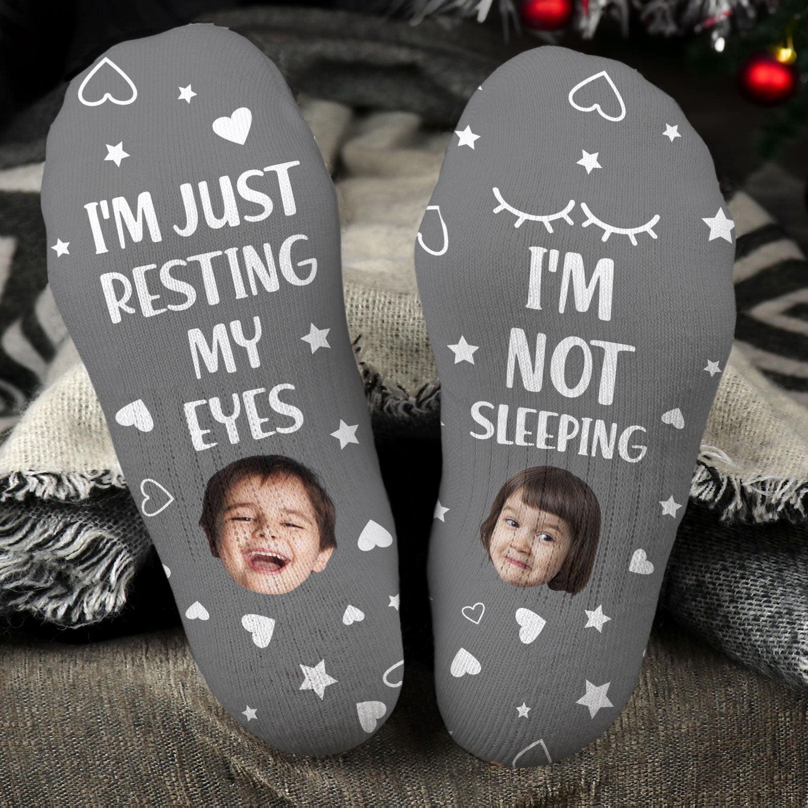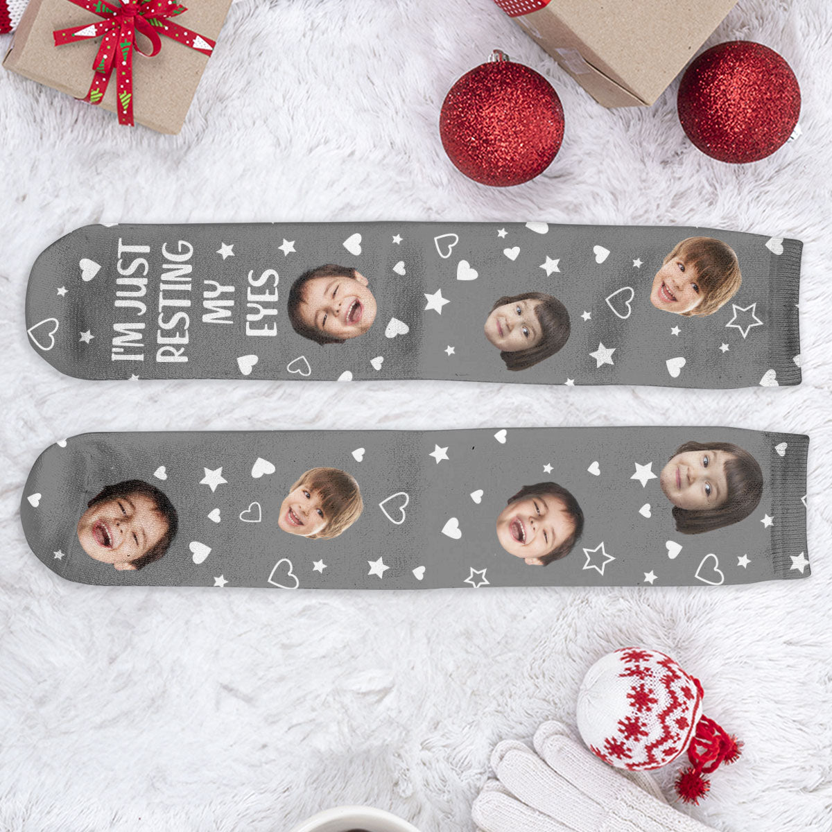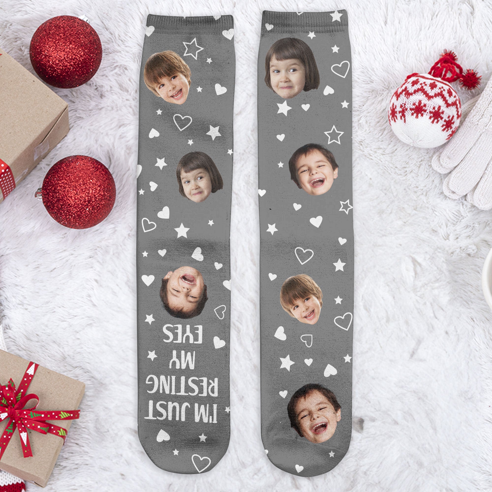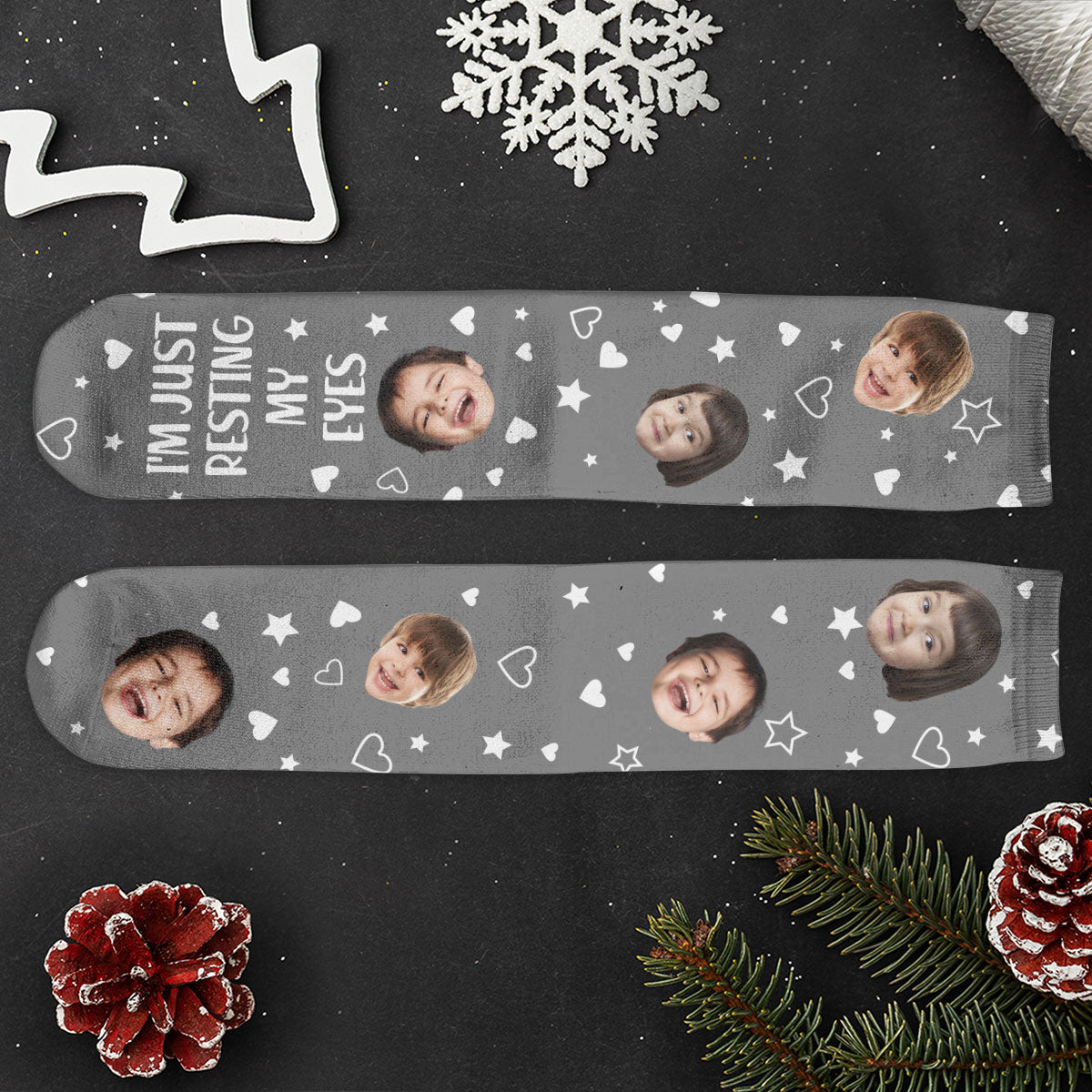 Introducing our Personalized Crew Socks: 'Custom Faces - I'm Just Resting My Eyes.' These socks are not just socks; they're a fun and personalized way to celebrate Dad on Father's Day, birthdays, Christmas, or retirement. Featuring custom faces of loved ones, they add a unique and heartfelt touch to his wardrobe. Perfect for dads from daughters, sons, or wives, these socks are a thoughtful and humorous gift that will bring a smile to his face with every step. Give him the gift of comfort and laughter with our Personalized Crew Socks – a great addition to his sock collection and a reminder of the special people in his life.