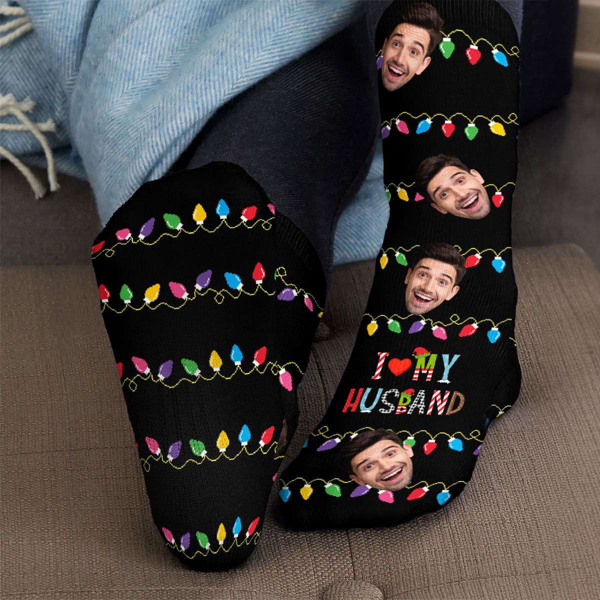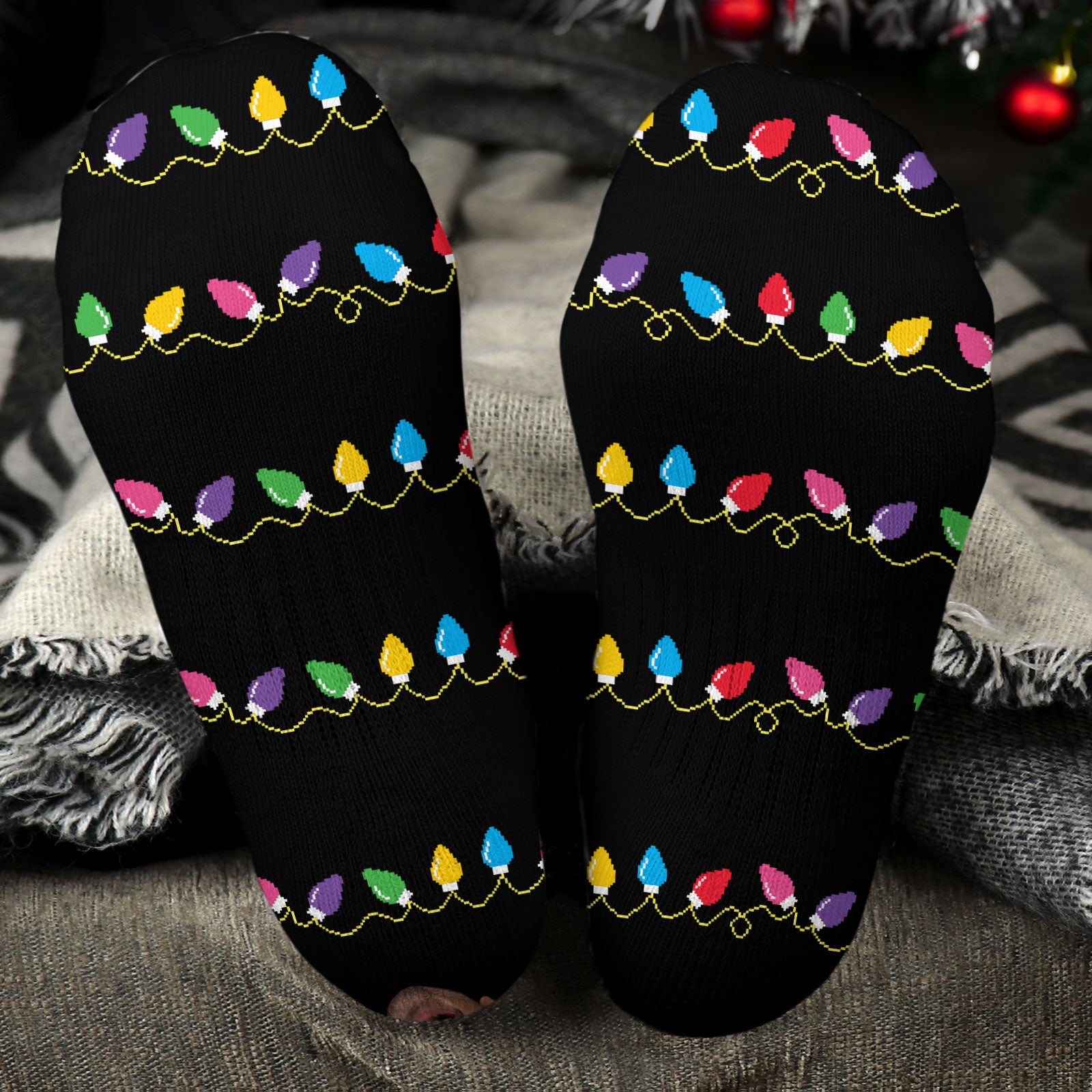 Christmas Light Socks - Add some festive cheer to your wardrobe with these funny Christmas socks. The stockings are decorated with colorful light ribbon patterns and an interesting proverb: 'Christmas Light Socks - Add some festive cheer to your wardrobe with these funny Christmas socks. The stockings are decorated with colorful light ribbon patterns and an interesting proverb: 'These are my Christmas movies watching socks'. They are perfect for the holiday season!