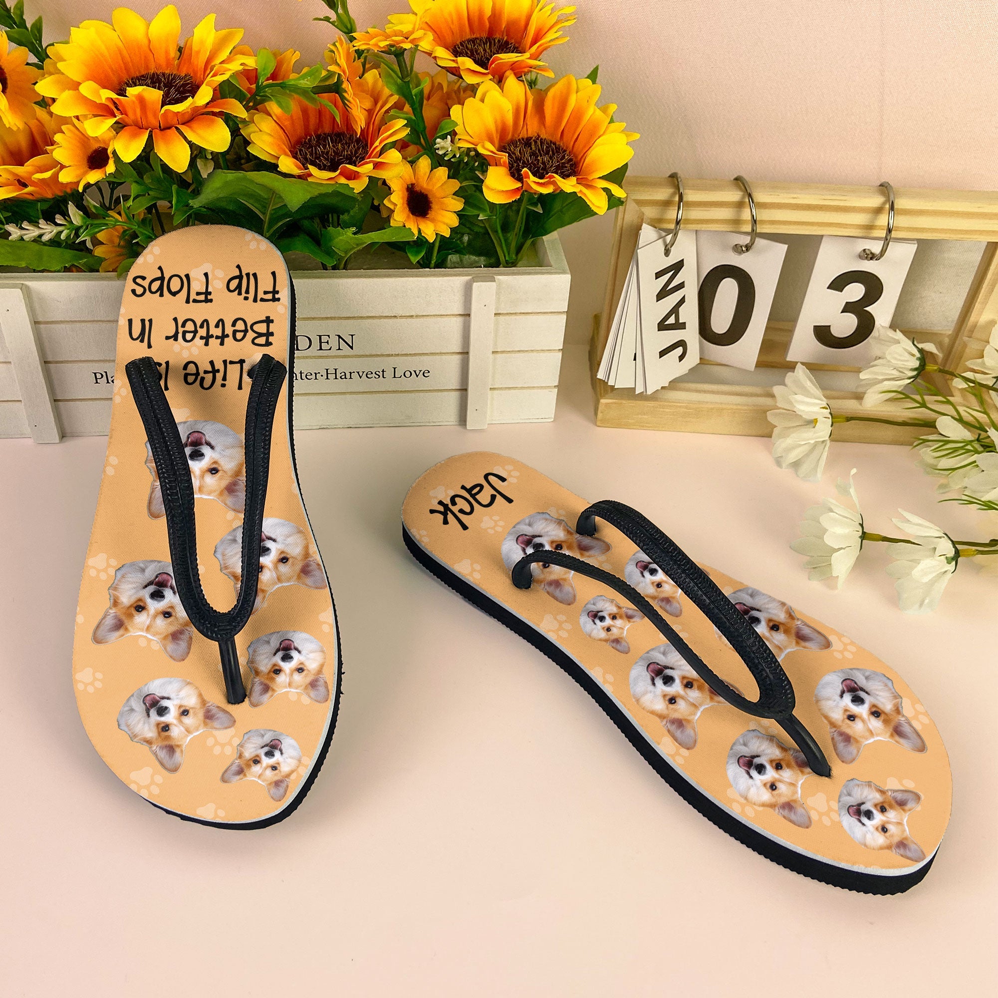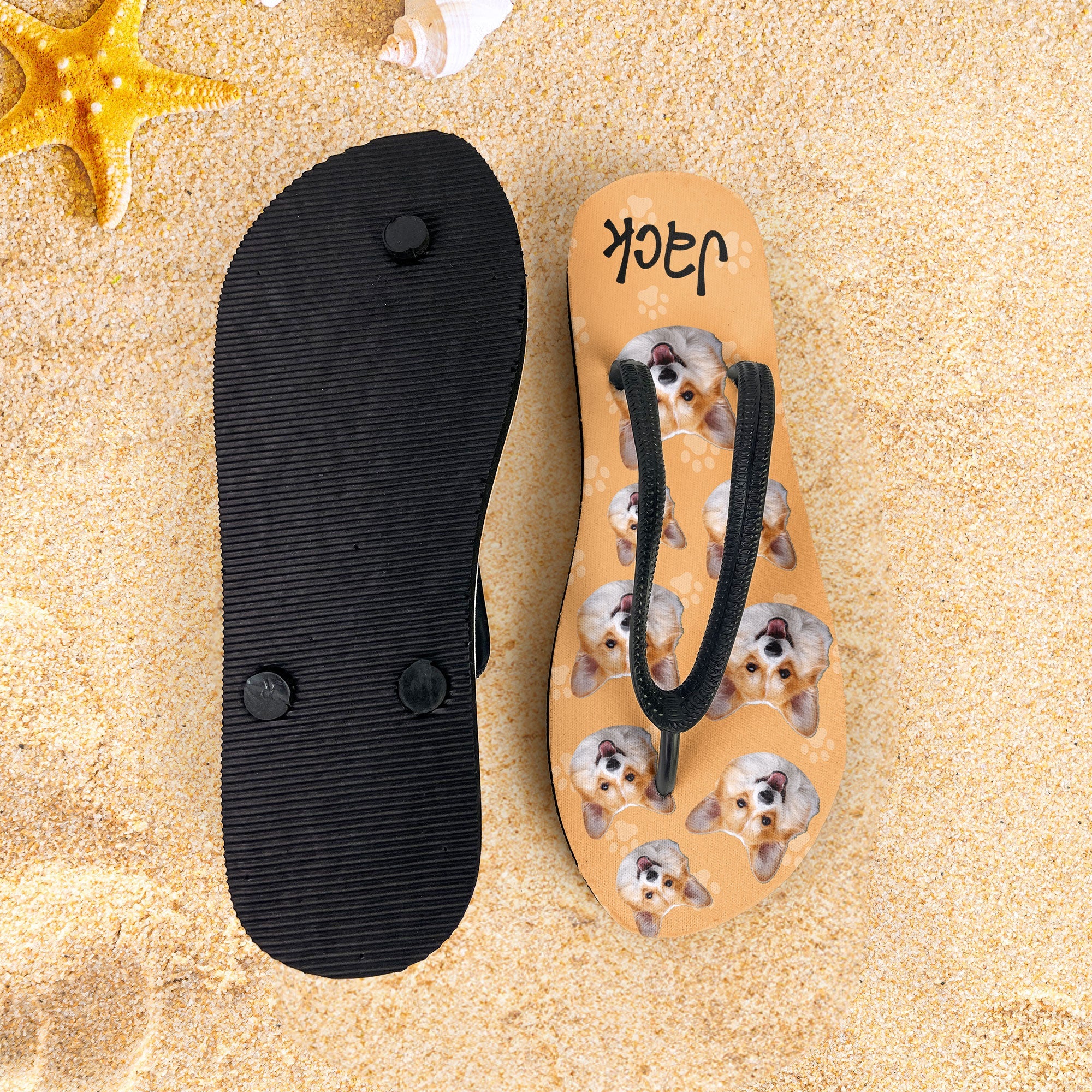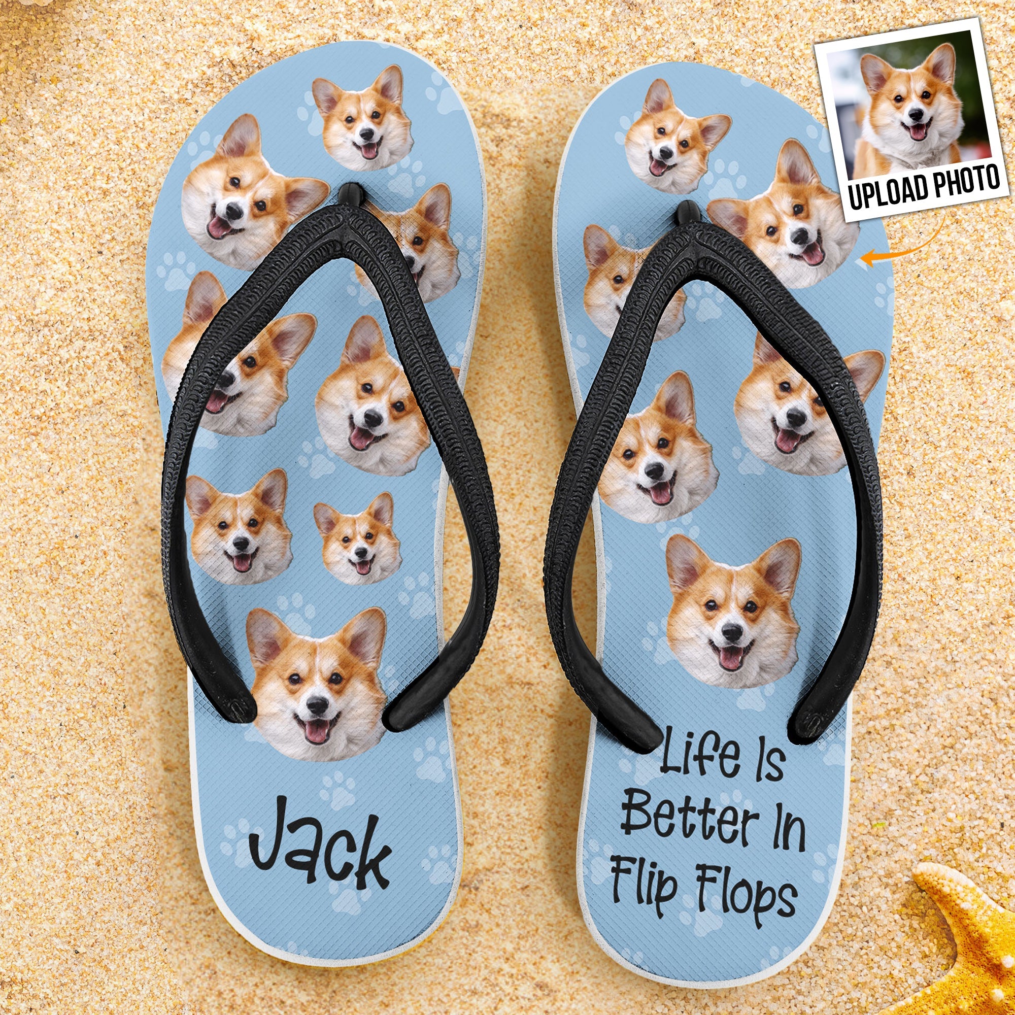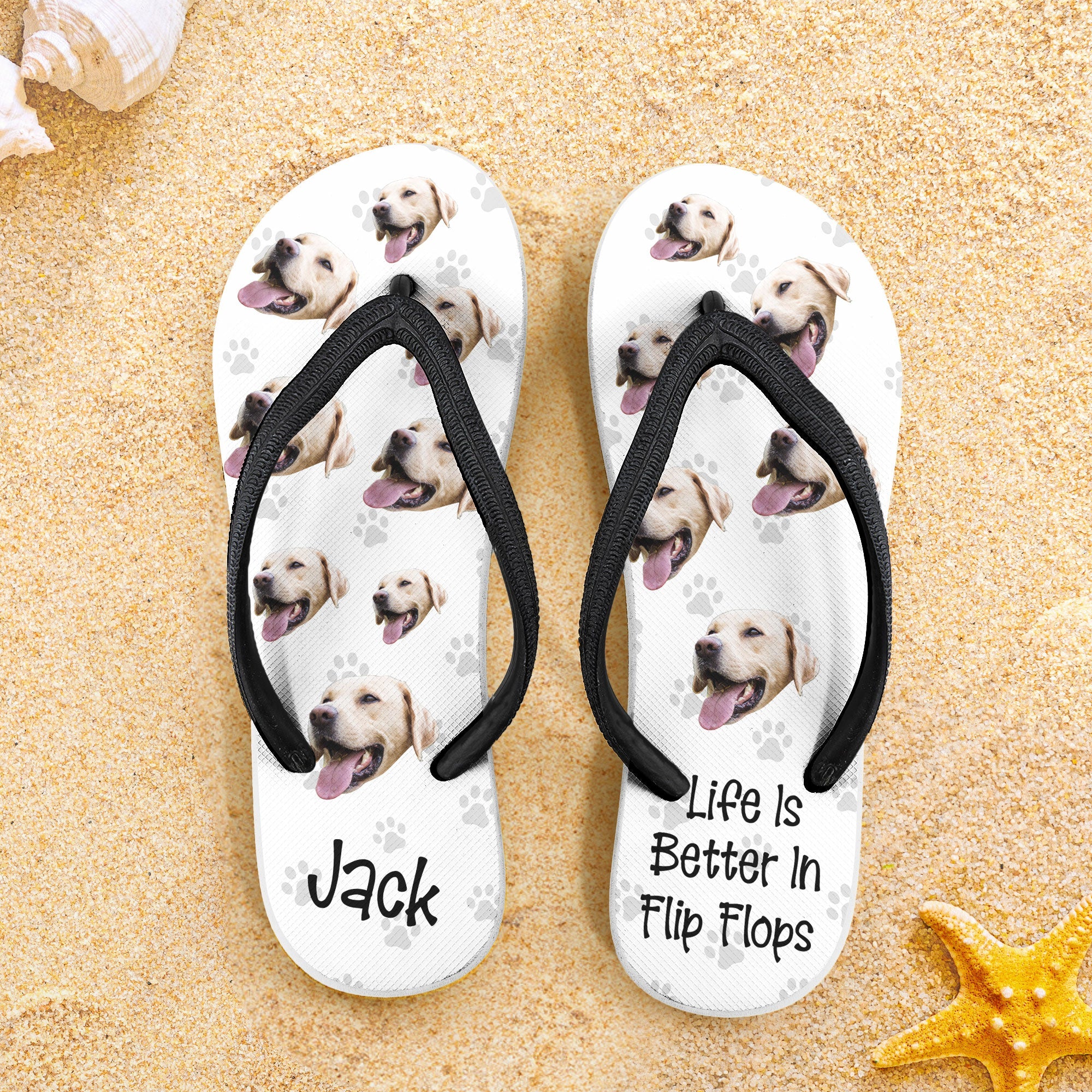 Get ready to turn heads at the beach with our Personalized Flip Flops, the ultimate beach slippers that say 'Life is better in flip flops.' These fun and unique flip flops feature your custom name and a custom head's photo of your dogs or your own photo, making them a perfect accessory for showing off your personality.