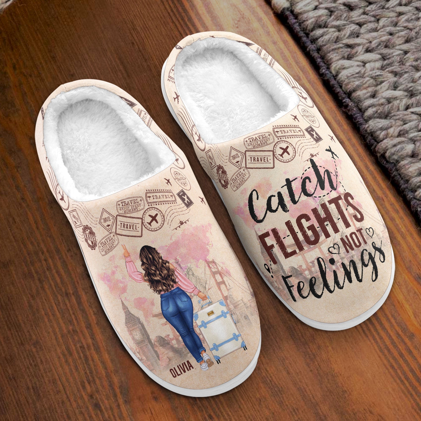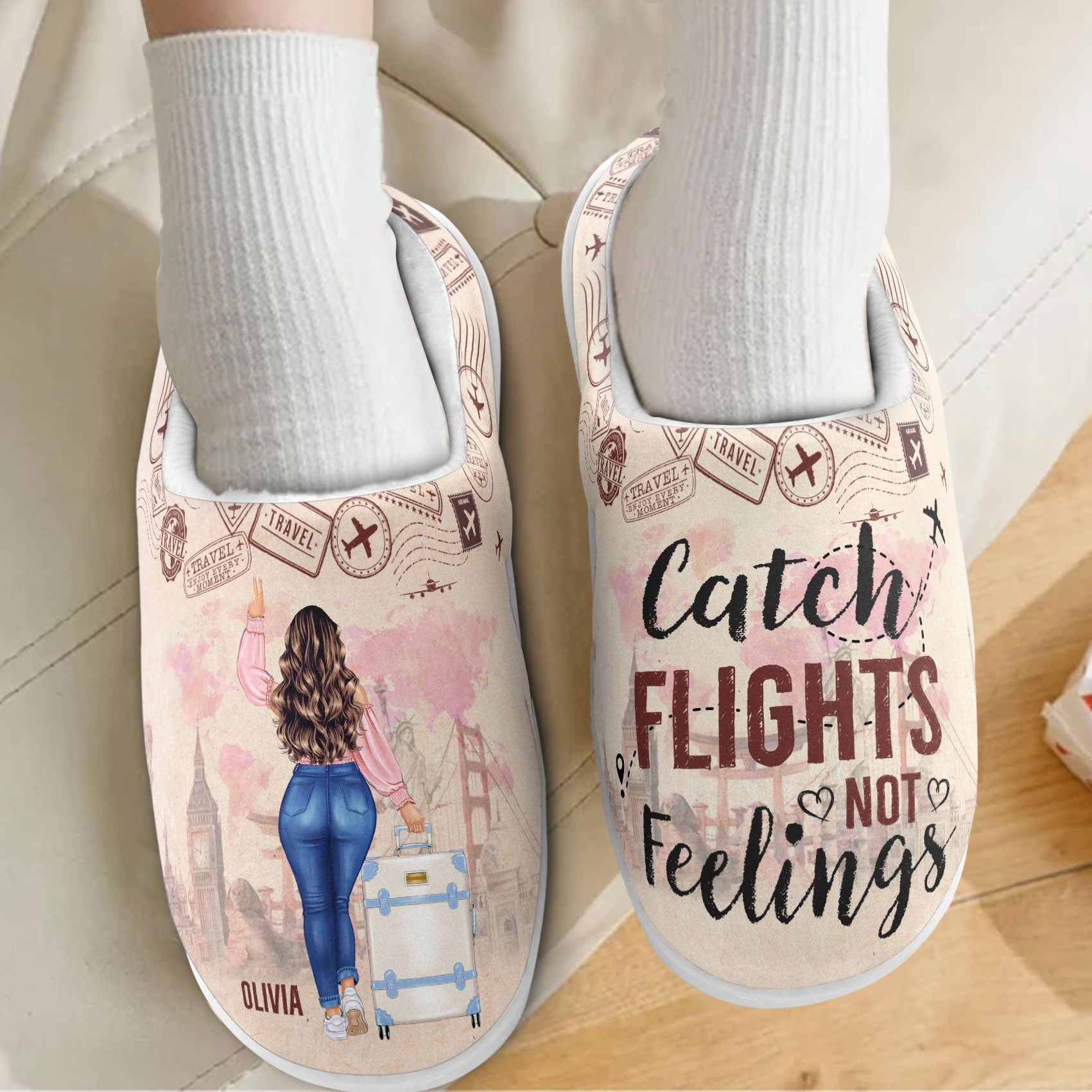 MESSAGE: Step into a world of comfort and adventure with Catch Flights Not Feelings Personalized Slippers!